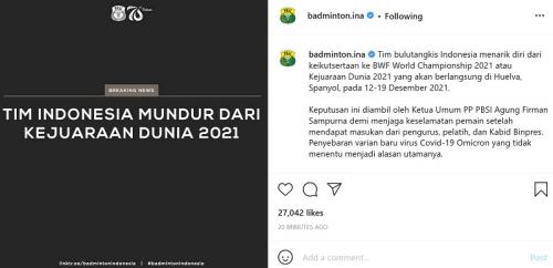 Bola88news.com – TIM Indonesia mundur dari BWF World Championship 2021 atau Kejuaraan Dunia Bulu Tangkis 2021. Kabar ini disampaikan oleh pihak Persatuan Bulu Tangkis Seluruh Indonesia (PBSI) dalam keterangan resmi yang diberikan Rabu (8/12/2021) pagi WIB. Karena Virus Baru Covid-19 Ajang BWF World Championship 2021 sendiri sejatinya akan digelar di Huelva, Spanyol, pada 12-19 Desember […]